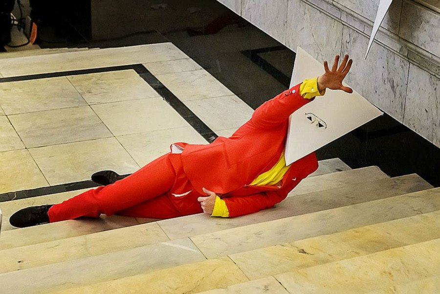 В один момент фигуры с плаката ожили. Им специально были пошиты костюмы, цвет которых для стиля достигался постобработкой