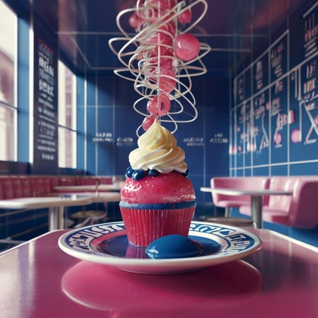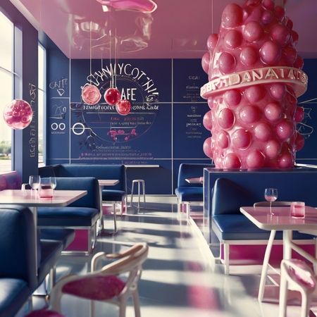 Промпт: «A cafe „Formula 402“ in a futuristic style. The main colors are bright acid pink and deep dark blue. The close-up image shows an unusual dessert, stylized as a human organs, made with high detail. The interior is decorated with white graphic elements such as lines and circles. The are desertt on the tables. The furniture has a smooth and streamlined shape».