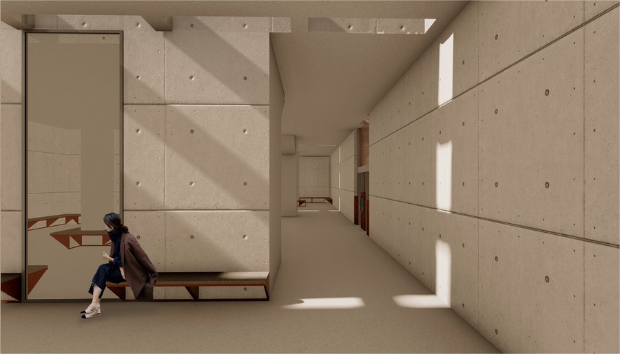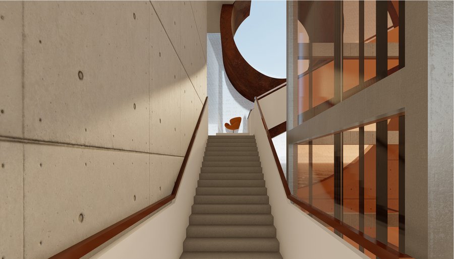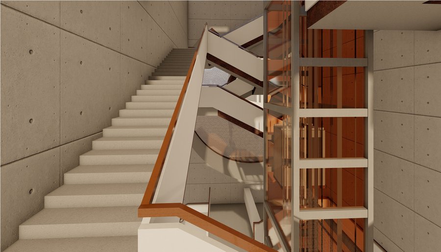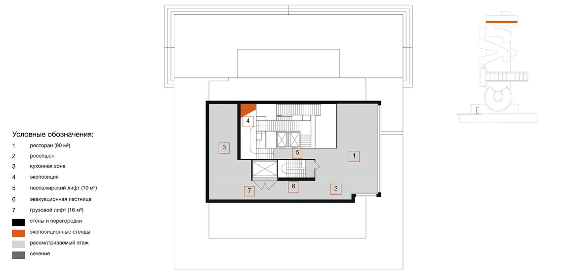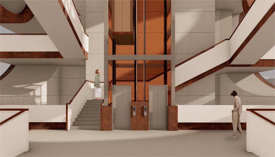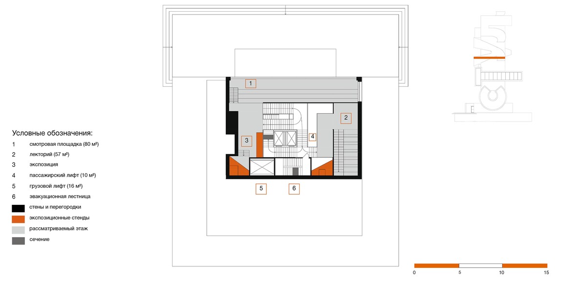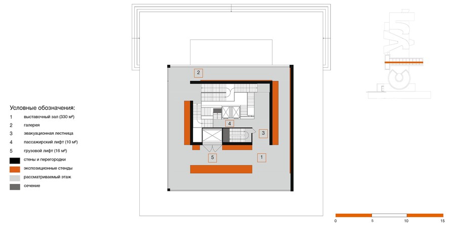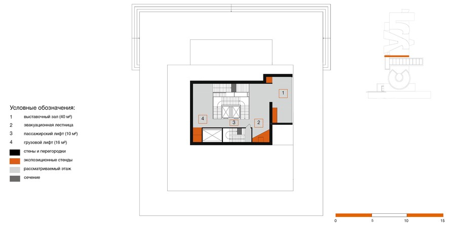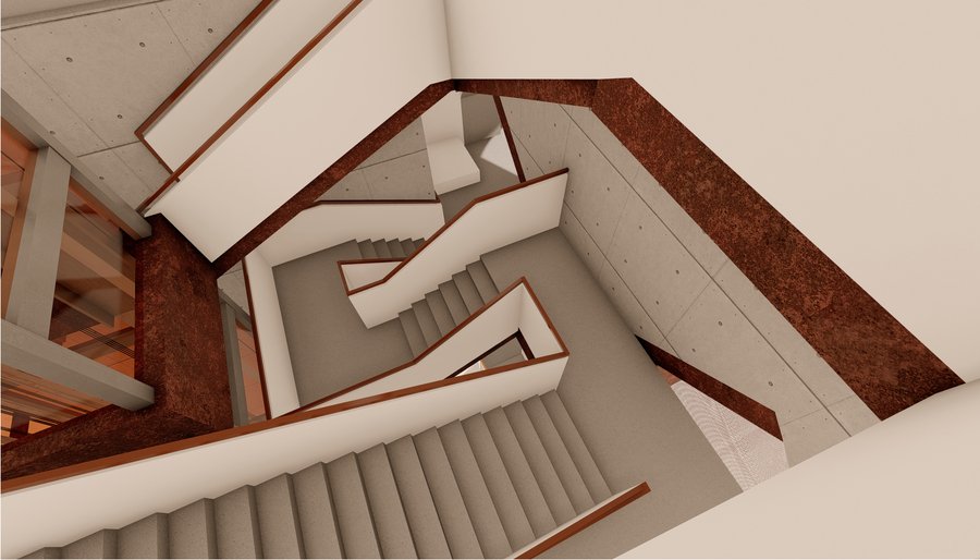 Пространство формируется из множества лестниц, образующих круговое движение, но по ходу экспозиции посетителю будет представлена возможность отойти от «кругового» течения истории и погрузиться в некотрые нюансы, выраженные в отдельных элементах экспозиции уходящей в иные направления от основного маршрута.