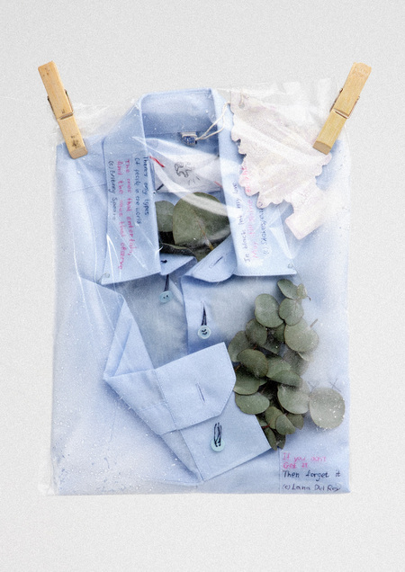 Главные качества моей идентичности: открытость, активность, любопытство и поиск нового. Инструменты визуализации: голубая классическая рубашка, прозрачная упаковка, лёд, снег, наполовину оторванные пуговицы и любимые цитаты.