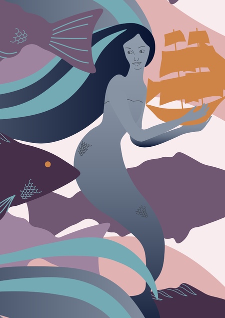 Серия платков о жизни русалок: то они игриво раскачиваются на волнах, то сливаются с косяком рыб и уходят глубоко под воду, то играют скораблями.