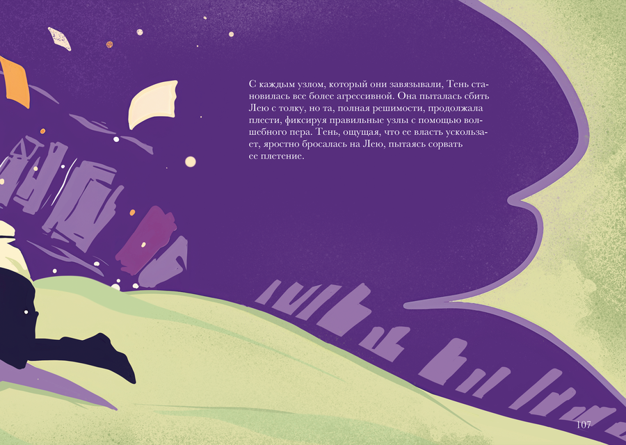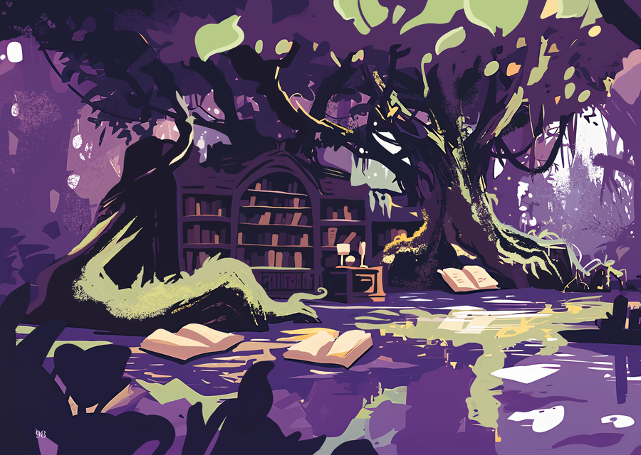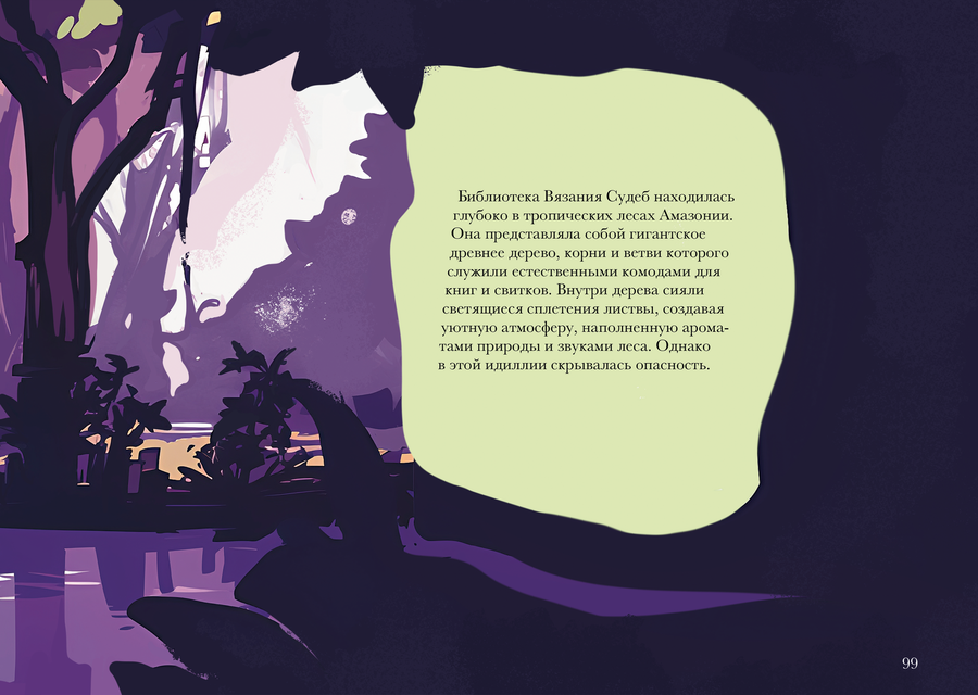 Глава 5 — Лесная библиотека: фиолетовые, зелёные и жёлтые тона.