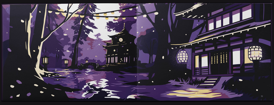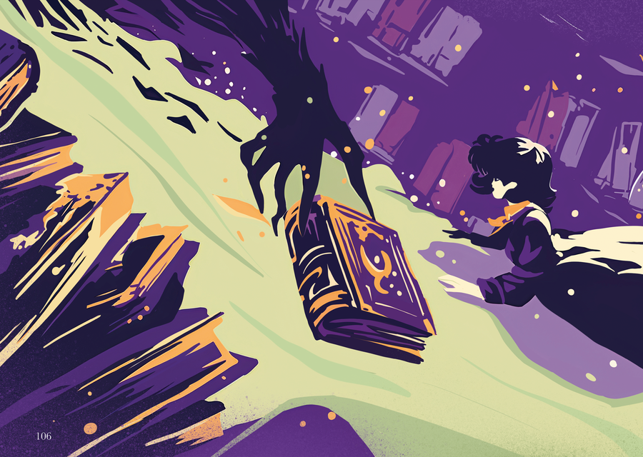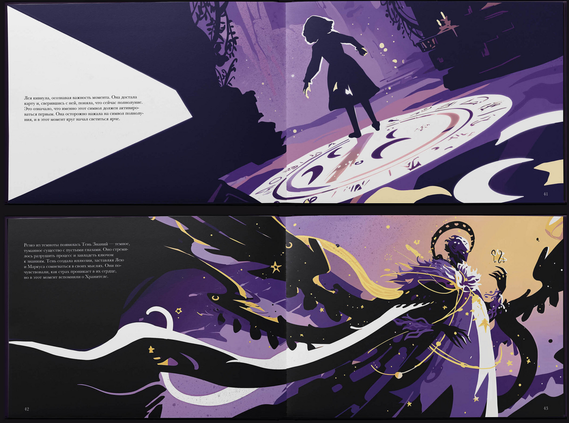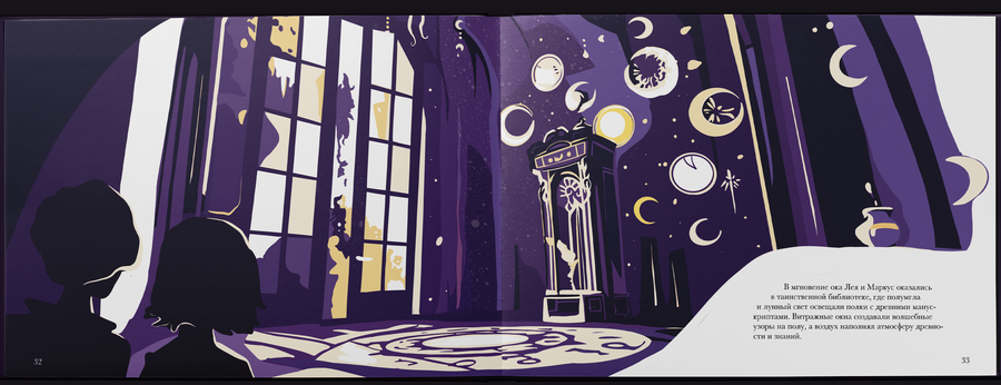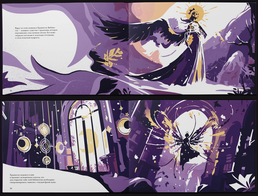 Глава 2 — Лунная библиотека: фиолетовые, белые и жёлтые оттенки.