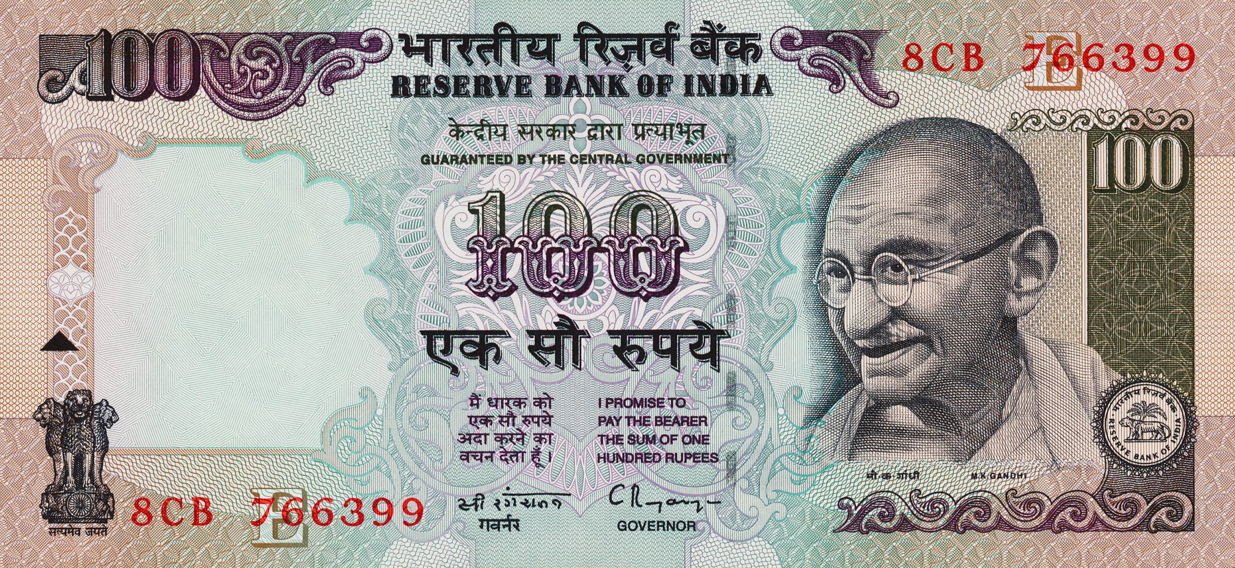 Купюра достоинством в 100 индийских рупий старого образца (дизайн изменён в декабре 2018 года). На лицевой стороне размещён портрет Махатмы Ганди, индийского политического и общественного деятеля, одного из руководителей и идеологов движения за независимость Индии от Великобритании. На оборотной стороне находится изображение горы Канченджанга в Гималаях, третьего по высоте восьмитысячника в мире (8586 м).