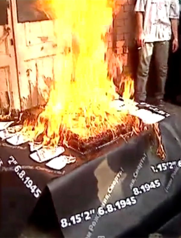 «Юбилей» первого ядерного удара московские художники отметили у американского посольства шествием с чёрными зонтами в ясный августовский полдень и сожжением огромного именинного торта. Сейчас эта акция интересна прежде всего как один из первых примеров удачного построения комплексного канала воздействия: айдентика, флэш-моб, событие, декларации, пресса.