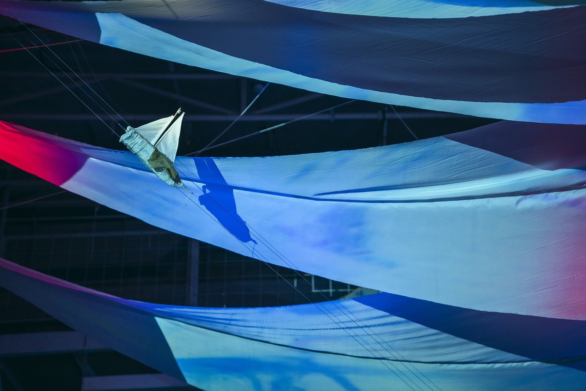 В работе над горизонтально и вертикально висящими парусами важной задачей стал выбор ткани. Мы исходили из наших запасов и взяли подкладочную белую ткань. Ее пластичности хватает, чтобы показать воздушность и легкость.