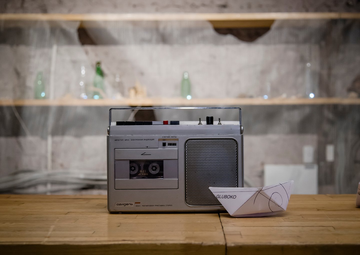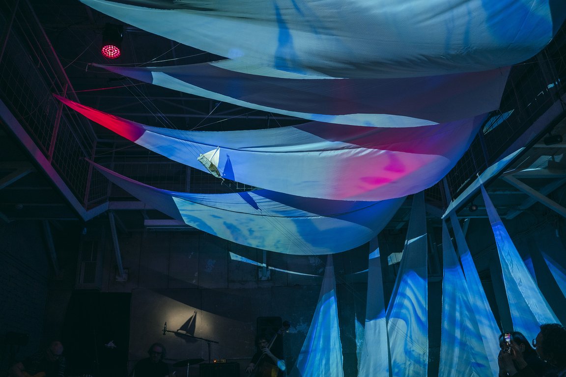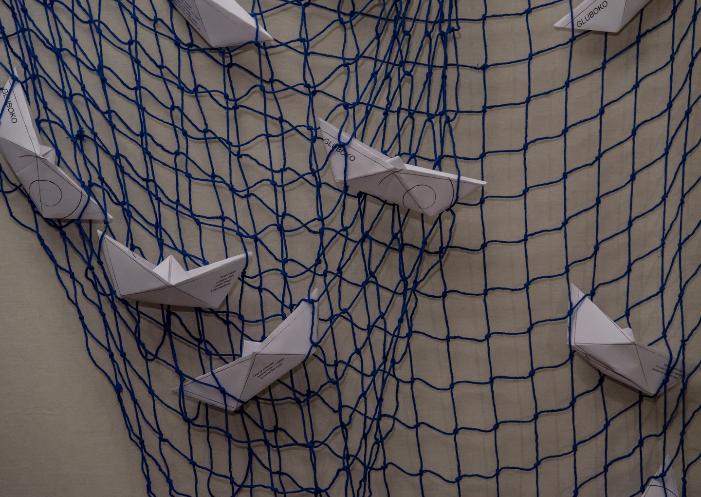 По правую стороны выставлены модульные конструкции с сетями, на которых находятся бумажные кораблики со стихами из ивента. Каждый зритель может взять себе на память кораблик.