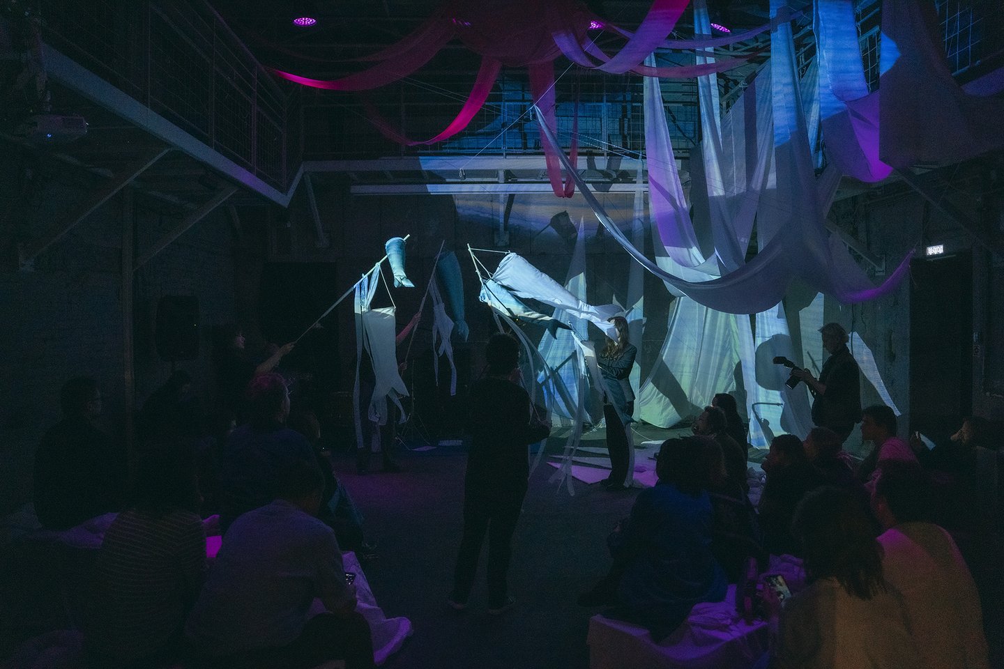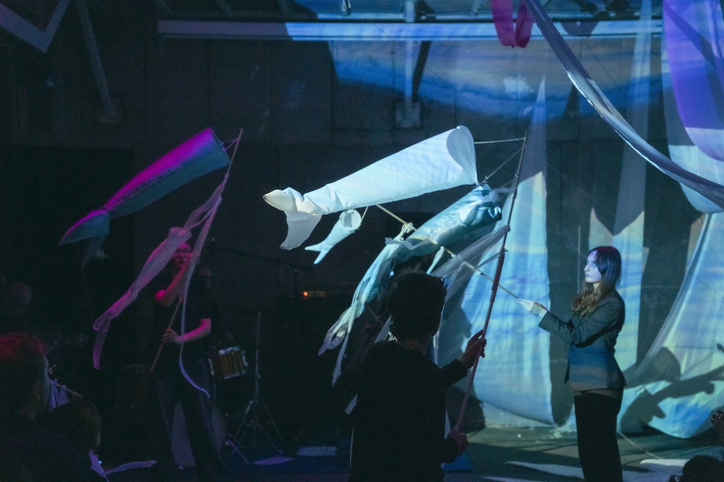 Для «летящих рыб» нужно было придумать одну удобную модульную форму, легкую и летящую. Здесь появился удобный пример — сачок. При взмахивании он раздувается и получается нужный эффект. После была придумана форма рыб с хвостами.