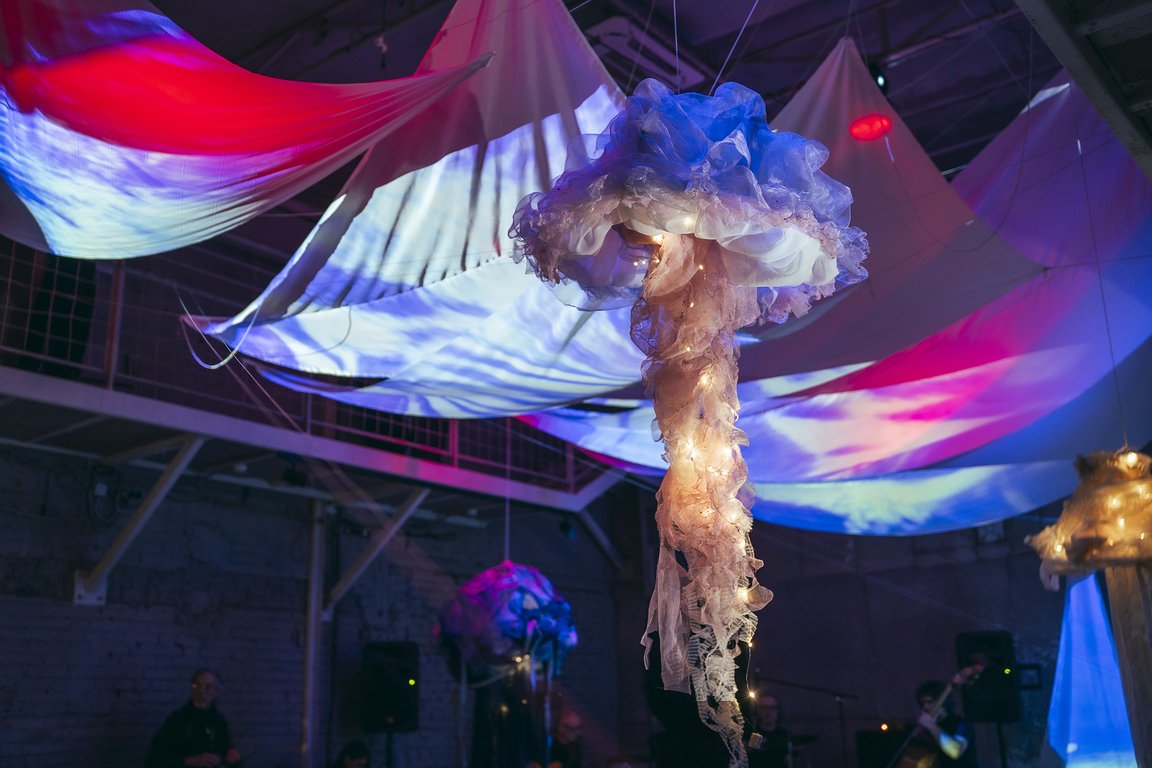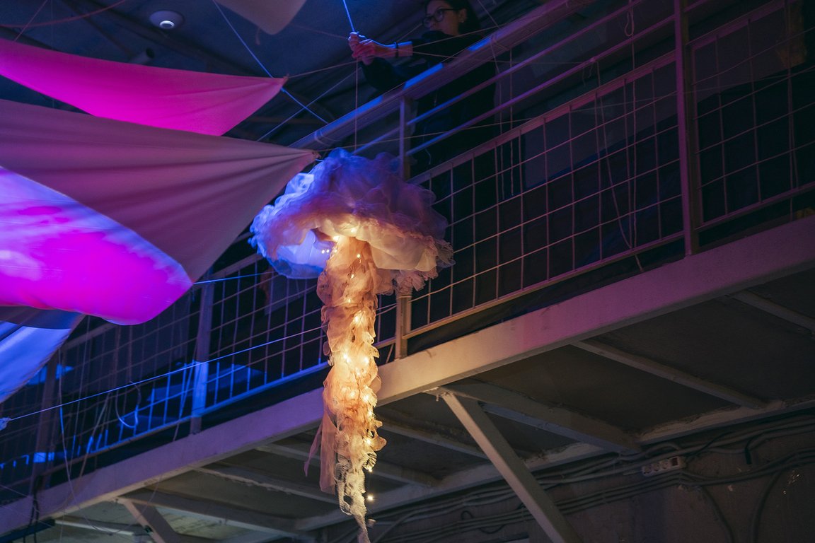 Еще одной важной деталью была монтировка гирлянд в медуз. Их светящиеся щупальца в темном зале создают волшебство и изящность.