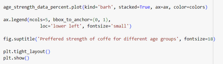 Данные по возрастным группам было удобнее оформлять горизонтальными диаграммами, на которых видно процентное соотношения показателя (чашек кофе / крепкость / прожарка) по группе.