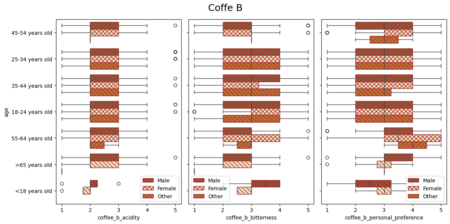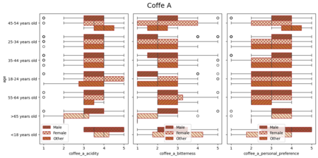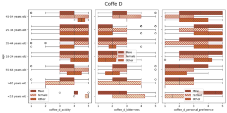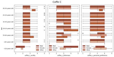 Последние четыре диаграммы посвящены оценке четырех кофейных напитков у групп разных возрастов и с показателями по полу. Результат представлялся в виде коробочных диаграмм.