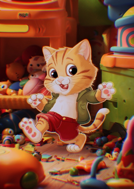 A delightful cartoon illustration featuring an adorable orange cat playing in a cluttered children’s room, filled with various toys and colorful objects. The cat, sporting red shorts and a green jacket, is shown with realistic features and a playful expression. The main colors in the room are oran