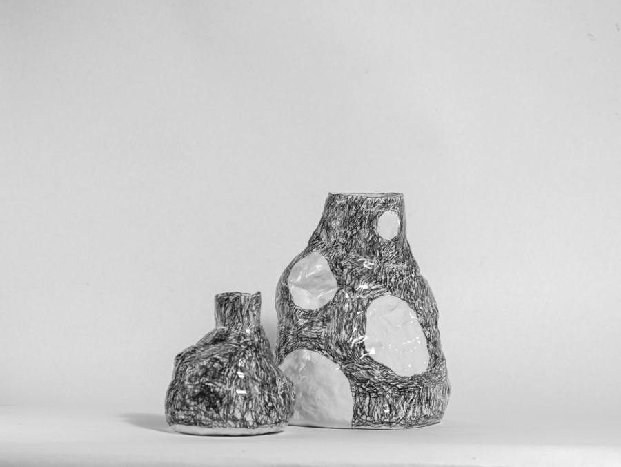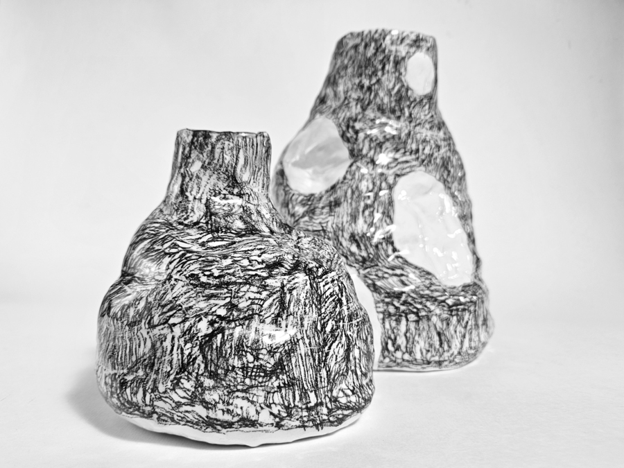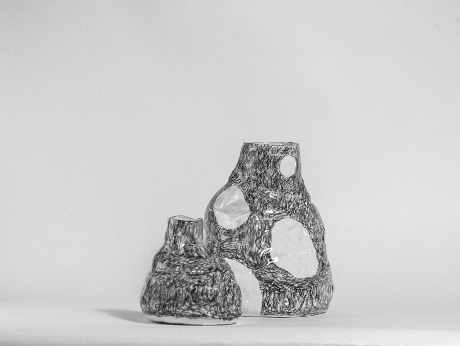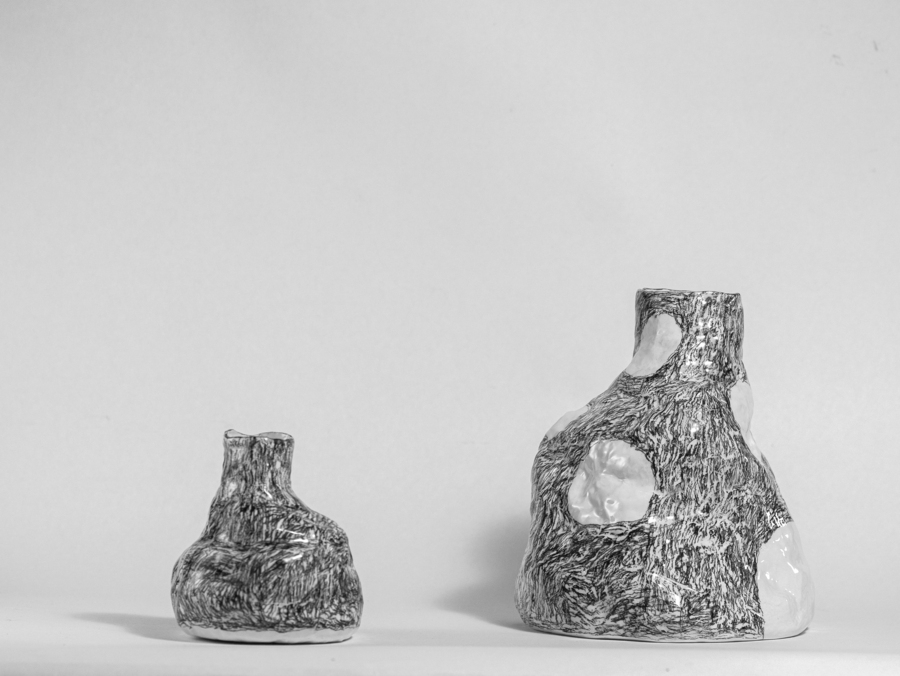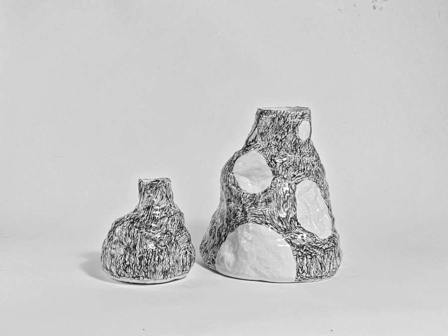 Two asymmetrical vases are made using the free modeling technique, the forms were assembled from pieces of white clay of different sizes and joined together in a chaotic order. This made it possible to create living tactile objects with an asymmetrical silhouette. By turning them to each other in different directions, you can play with them, regulate the mood and the level of their interaction. The naive pencil drawing adds character to the vases and helps to reveal the surface texture, emphasizing the small details that arose during production.