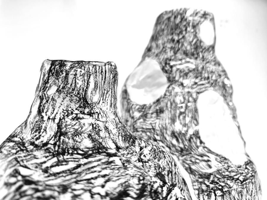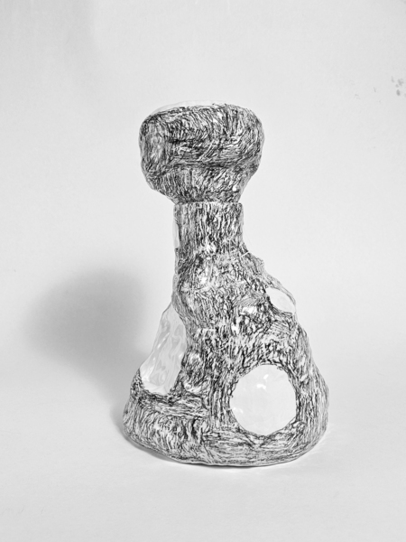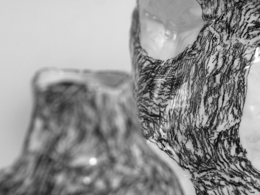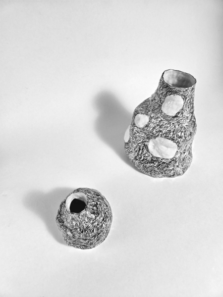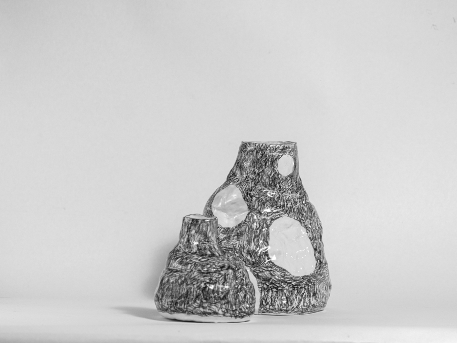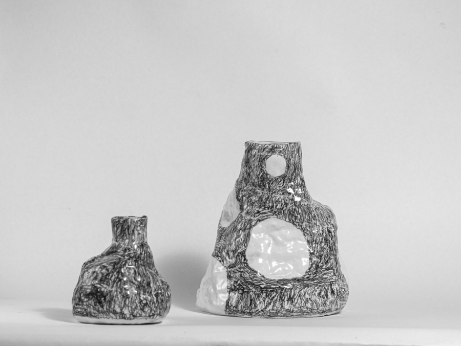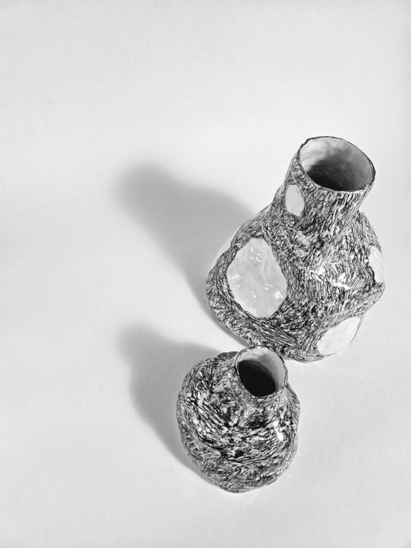 Two asymmetrical vases are made using the free modeling technique, the forms were assembled from pieces of white clay of different sizes and joined together in a chaotic order. This made it possible to create living tactile objects with an asymmetrical silhouette. By turning them to each other in different directions, you can play with them, regulate the mood and the level of their interaction. The naive pencil drawing adds character to the vases and helps to reveal the surface texture, emphasizing the small details that arose during production.