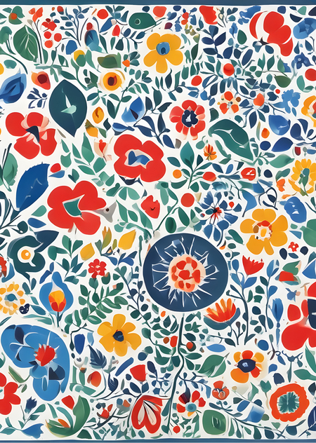 Промпт: A vibrant silk scarf design inspired by Henri Matisse’s cut-outs, featuring bold shapes mostly in blue, then yellow, green and red, asymmetrical composition, white negative space, clean lines, artistic textile pattern. there may be flowers, fruits etc, all drawn with very simple flowy shapes.