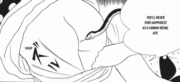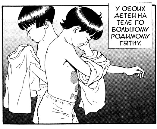 Тем не менее диктуется избранность персонажей. Близнецам даются новые имена, что символически обозначает новый этап жизни — эксплуатацию детей в цирке уродов. Как уже было отмечено, зрение — важный символ в творчестве Суэхиро Маруо, если часто он изображает дефекты, чтобы привлечь внмание к персонажу или проиллюстрировать его искаженный взгляд на мир, то в этом случае мангака подчеркивает мнимый дар персонажей. Они названы в честь глазных капель и призваны к провидению, согласно тропу сделки с дьяволом: взамен на дефект им дается суперсила. Однако, поскольку во второй главе было отмечено, что приспешник дьявола — ложь, то и способность к провидению — не более чем фокус.