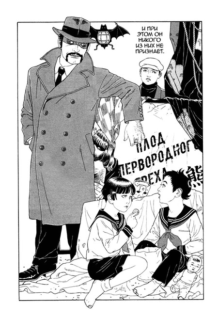 В манге Томино в аду вина окрашена в благочестивый оттенок, свойственный католическому консервативному обществу. Теологически, каждый человек виноват по факту своего рождения. Эта философия продолжает предыдущую главу о мнимой провокативности, поскольку хоть и пользуется иными средствами, но достигает того же — логического оправдания насилия над невинными. Вынесение приговора о врожденной греховности упраздняет проблему теодицеи и позволяет вопринимать любое преступление как наказание за грехи. Дефектность персонажей пропущена через призму средневекового сознания: уродства персонажей свидетельствуют об их вине. Тот факт, что карлик помнит свое рождение превращает несчастный случай в осознанное убийство, а родимое пятно на теле близнецов служит как метка о их сомнительном происхождении. Надпись «Плод первородного греха» оформлена как обвинительный приговор, а дети сидят у нее как у позорного столба.