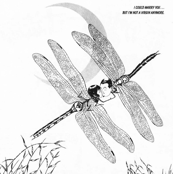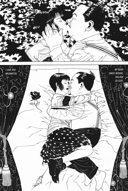 Сцена продажи цветка, оформленная крупными планами и тонированными силуэтами, выглядит достаточно интимно, а диалог напоминает флирт. Девочка протягивает мужчине розу, выражение «сорвать цветок» часто используется в контексте потери девственности. Герои находятся наедине, девочка первая начинает диалог, при этом говорит о своей стеснительности — в сумме это вызывает неоднозначное впечатление. Автор оформляет сцену таким образом, чтобы дать понять зрителю, будто это Мидори проявляет инициативу и просит мужчину забрать ее цветок. Через сверхкрупный план делается акцент на губы девочки, текстуально и визуально они сравниваются с распустившимся цветком, что выглядит достаточно двусмысленно.