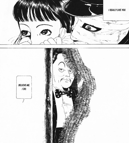 По ходу повествования интонация лжи насыщается все более мрачными и зловещими оттенками. Если в начале манги зрителю давали намек на иллюзорность происходящего через образ искусственных цветов, то завершается она сценой предательства. В середине манги карлик обнимает Мидори и одаривает ее обещаниями, в конце — герои визуально разносятся по разным фреймам, что символизирует предательство и расставание, к тому же, иллюзионист помещен в композиционный центр, его окружают обидчики Мидори. Таким образом, предательство является апофеозом лжи, являя собой иллюзию преданности.