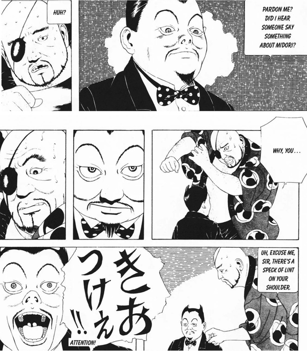 Суэхиро Маруо с изощренным искусством обрисовывает обманчивость среды и окружения персонажа. Так, одним из знакомых Мидори становится мальчик-девочка. Двуполость в принципе сбивает с толку, но поскольку зритель, как и главная героиня, был убежден, что перед ним девочка, эффект тем более обескураживает. Не смотря на откровенный характер жанра, мангака достаточно изысканно изображает двуполость персонажа через визуальный ряд из четырех фреймов: герой отворачивается, чтобы справить нужду стоя. Выбор фреймов одинкового размера создает медитативный равномерный ритм, сопровождающий стадии последовательного осознания изменчивой реальности. Такой же непредвиденной становится сцена с убийством щенков — автор не давал никаких препосылок о садизме героя, он лишь демонстрирует сцены жестокости сразу после трогательной зарисовки игры Мидори с щенками. Такая резкая ошеломляющая смена тона повествования работает провокацией и в очередной раз доказывает обманчивость мира. Шок усиливает то, что садизм совершается ребенком, от которого такого поведения не ждешь, который к тому же он внешне похож на Мидори, а она в свою очередь производит невинное впечатление.