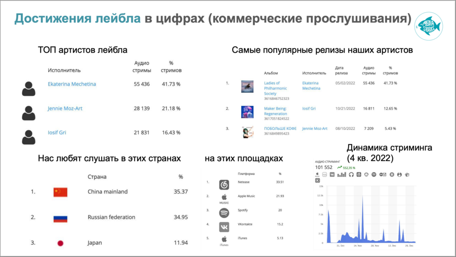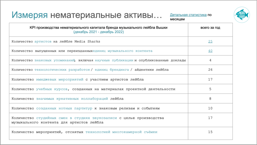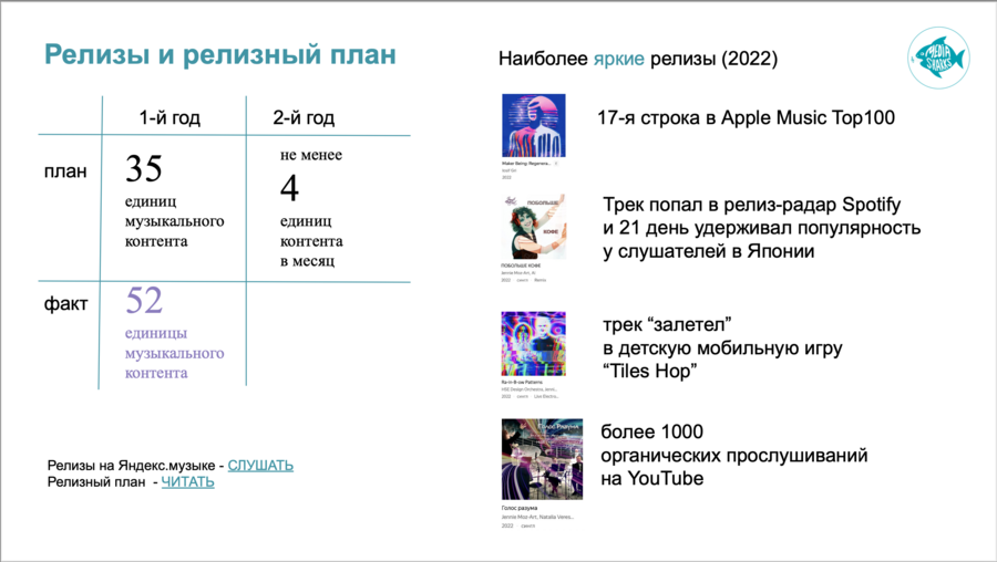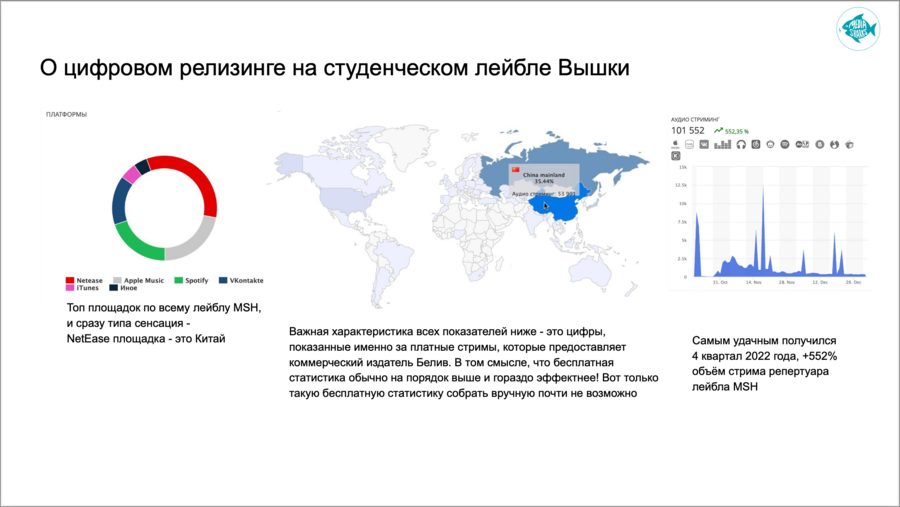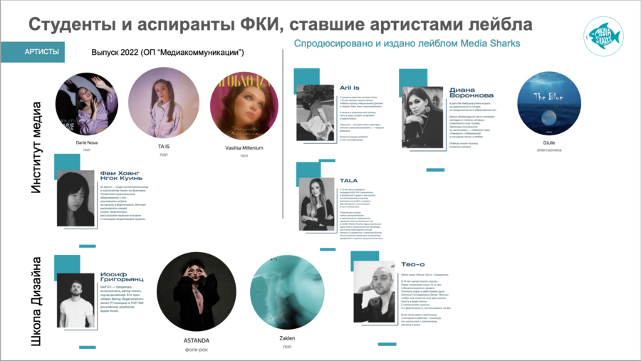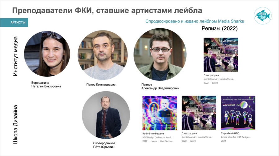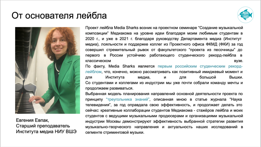 Основанный аспиранткой АШ по искусству и дизайну НИУ ВШЭ в декабре 2021 г., лейбл Media Sharks за три года деятельности зарекомендовал себя как площадка для тестирования гипотез о монетизации музыкального контента, созданного студентами и сотрудниками НИУ ВШЭ.