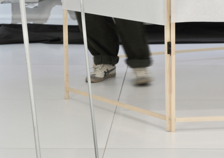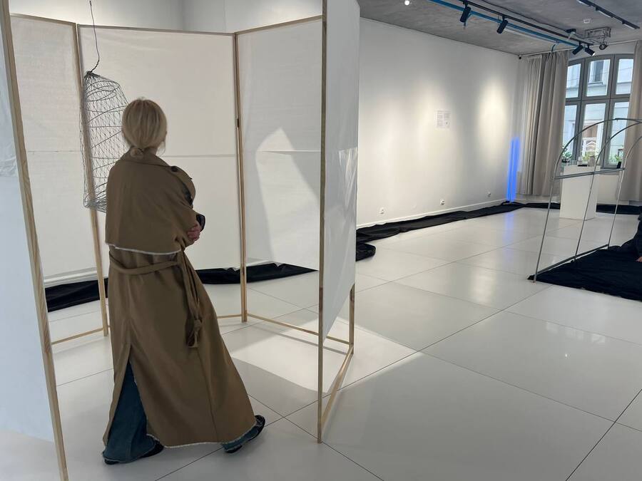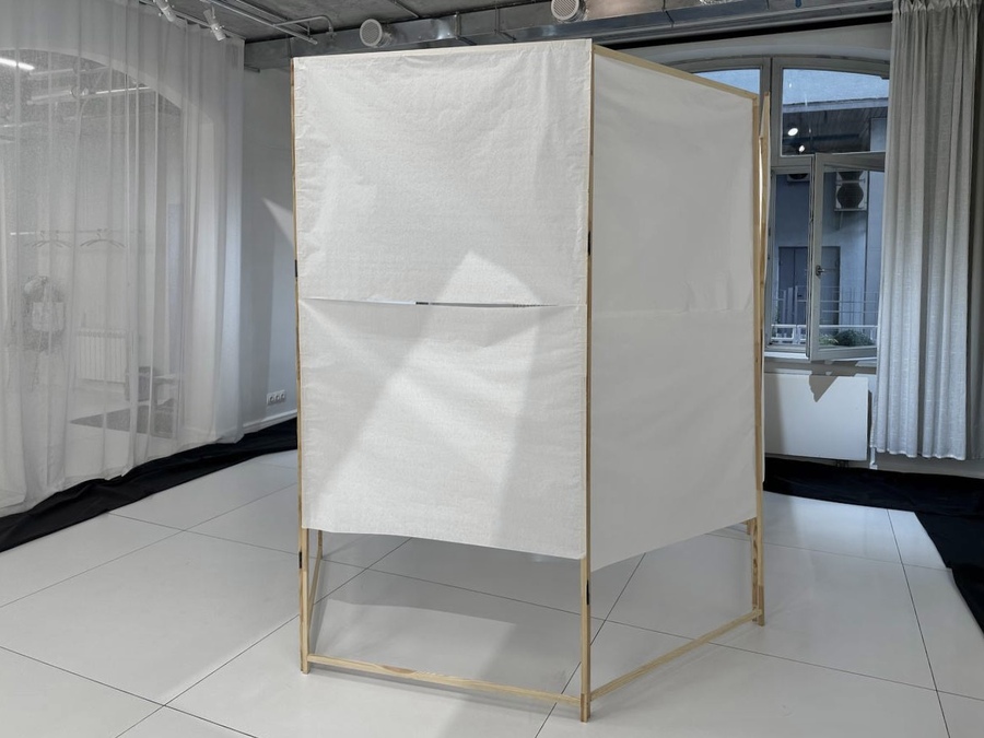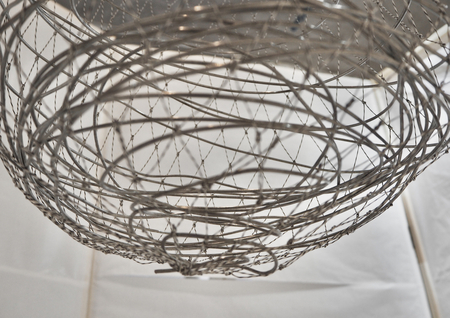 Приглашающе приоткрытые стены-ширмы зовут войти в их пространство, давая возможность рассмотреть оберегаемый ими объект сплетения. Подвешенная в центре металлическая спираль, удерживает форму кокона лишь благодаря, поймавшей её, тонкой сети. Имитация кокона пуста, так как искусственно сконструирована манипуляциями извне, в отличии от его природного образа, создающегося актором из собственного тела. Спираль закручена насильно, а обволакивающая её сеть является как поддерживающим элементом, так и ловушкой, не дающей кокону размотаться и развеять миф о своей наполненности. Кокон как лиминальное пространство и транзитивный объект. Неподвижный транспорт от состояния А к состоянию Б, весь процесс скрывающийся под тонкой оболочкой. Центрально подвешенный внутри полукруга шатких стен, он представляет цикл как в своей форме, так и в контрформе, назначая главенство содержащемуся внутри себя. В природе не существует кокона, созданного актором не изнутри. Отсутствие следов присутствия внутри не вскрытой, но распустившейся от времени оболочки, приоткрывает «занавесу истины» о том, что внутри никогда никого и не было. Кокон пуст, но не опустошён. Что свидетельствует о том, что имитация кокона была создана извне, выставленная оригиналом, подразумевающим наличие внутри живого и дышащего. Перекрытие доступа к обзору, во избежании смут и сомнений, позволяет мифу одержать победу над реальностью. 1:0 в пользу фальсификации истины. 1:0 против веры привычным знаниям. Игра на доверие, в случае проигрыша, может перерасти в самообман, из-за нежелания принять поражения и признать неблагонадёжность источника. Совершая обход свисающего комка переплетений, можно услышать слабый отзвук природного мотива. Стратегия «замереть и прислушаться» оказывается нерабочей, так как противоположна условиям возникновения этой мелодии ветра. Как её уловить? Откуда она исходит, из мира, загороженного ширмами? или из самого кокона? И не является ли она фантомом, созданным неспокойным разумом? Звук сводит с ума своей нестабильностью и приводит к сооружению вымышленной константы, издающей его.