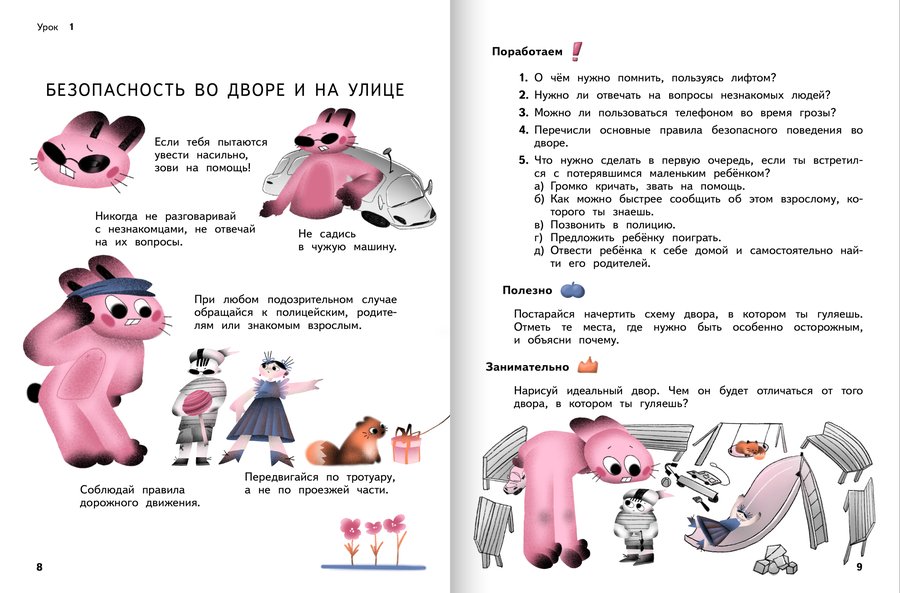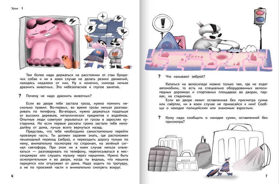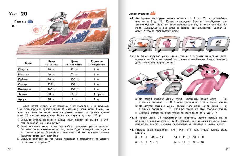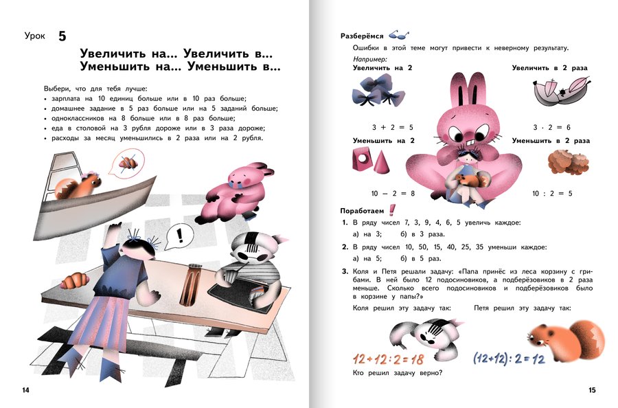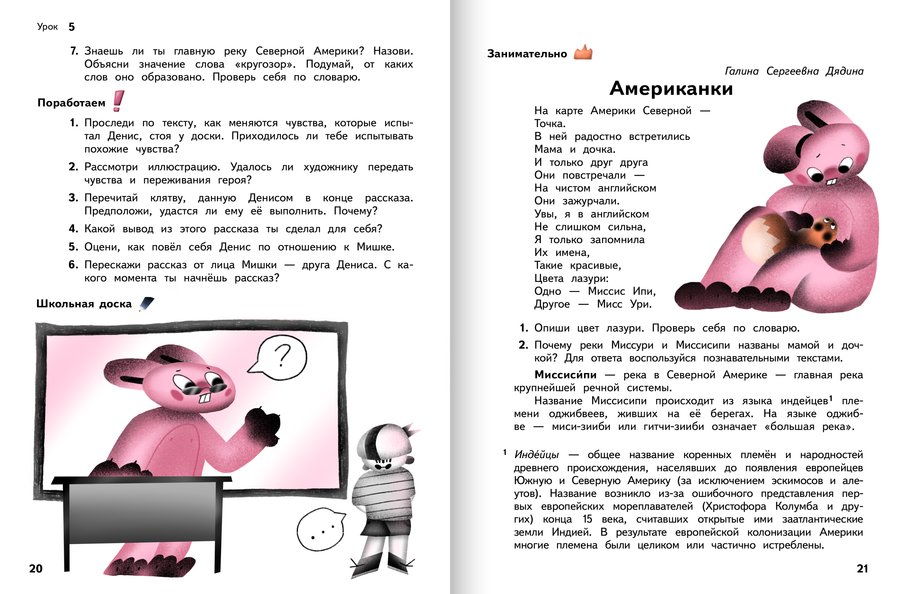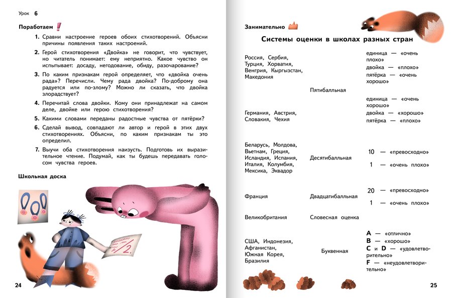 Помимо иллюстрирования учебников, я дополнительно разработала альтернативную верстку. Новая типографика показана на примере разворотов из учебников русского языка, окружающего мира и математики. Цветовые индикаторы на разворотах указывают на предмет.