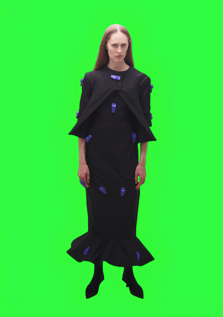 В основе проекта — идея motion capture: технологии, в которой тело распадается на точки и превращается в структуру, готовую принять любую форму. Алармы, встроенные в одежду как декоративные элементы, заменяют цифровые датчики —такие, что в виртуальной среде позволяют становиться кем угодно. Они фиксируют не кражу, а переход: момент, когда одна форма исчезает, а другая только начинает проявляться.