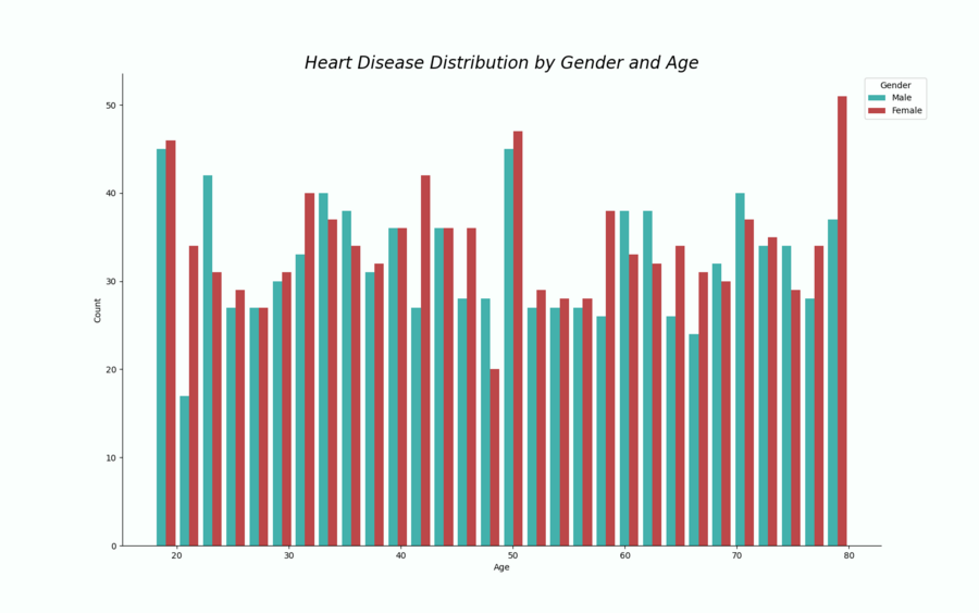 В первом графике я захотела увидеть распределение по полу и возрасту с заболеваниями сердца. Пиковых значених гистограмма достигает на отметке в 20 и 50 лет, в большей степени от сердечных заболеваний страдают женщины.