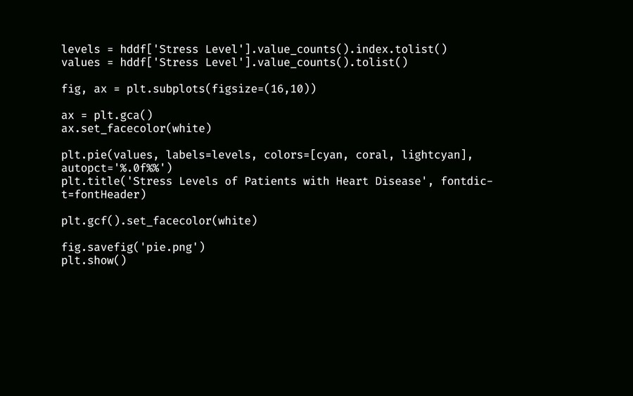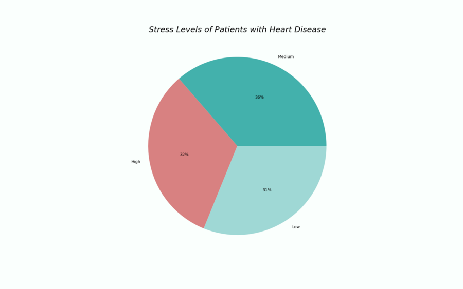 Далее мне стало интересно увидеть соотношение уровня стресса среди людей с заболеваниями сердца. Диаграмма показывает, что средний и высокий уровни стресса преобладают.