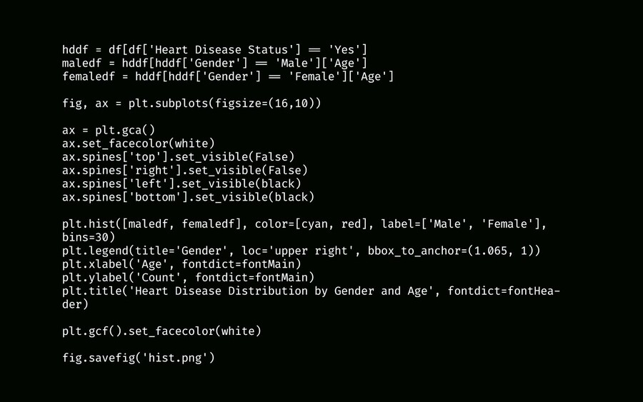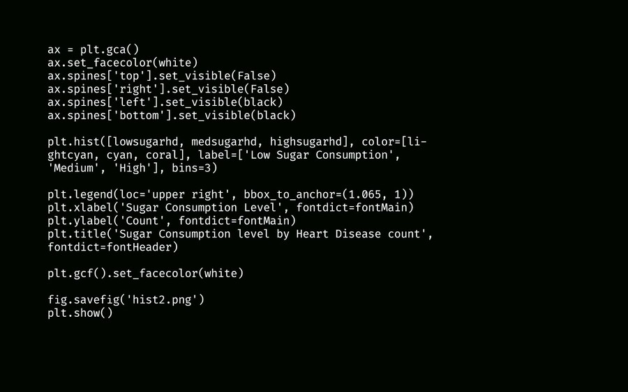 Для проекта использовался датасет Heart Disease Data for Health Research, который можно использовать для машинного обучения, чтобы предугадывать риск развития сердечных заболеваний. В работе я использовала гистограммы (наглядно показывает соотношение пола и возраста больных, а также уровень потребления сахара), круговые диаграммы (уровень стресса у больных и курят ли они), а также график (изменение ИМТ и уровня сахара в крови в зависимости от возраста).