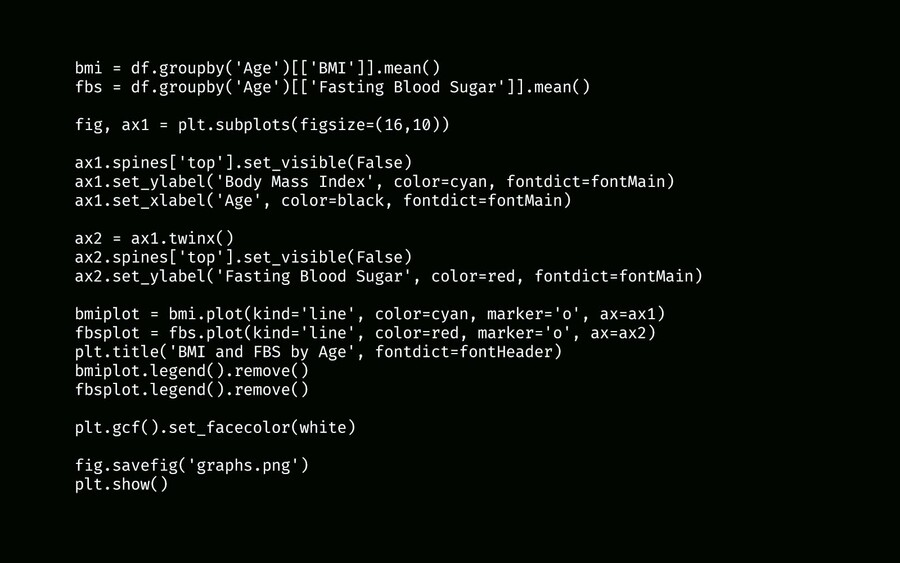 Последним был создан график изменения ИМТ и уровня сахара в крови с возрастом среди людей с заболеваниями сердца. Диабет и высокий ИМТ повышают риски развития заболеваний. С возрастом наблюдается тренд на снижение уровня сахара в крови и повышения ИМТ.
