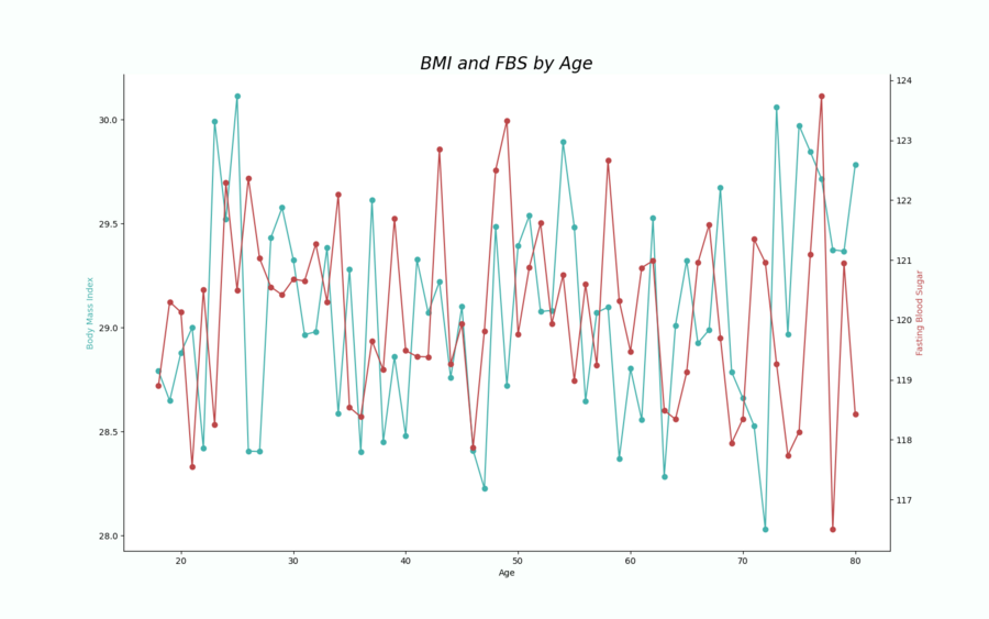 Двойной график. Изменение ИМТ и уровня сахара в крови с возрастом.