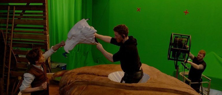 В сценах с полетом была использованная компьютерная графика, но изготовлена я модель присутствовала в статичных сценах. Таким образом получилось оптимизировать процесс съемки некоторых сцена и дать возможность актерам легче вжиться в роль.