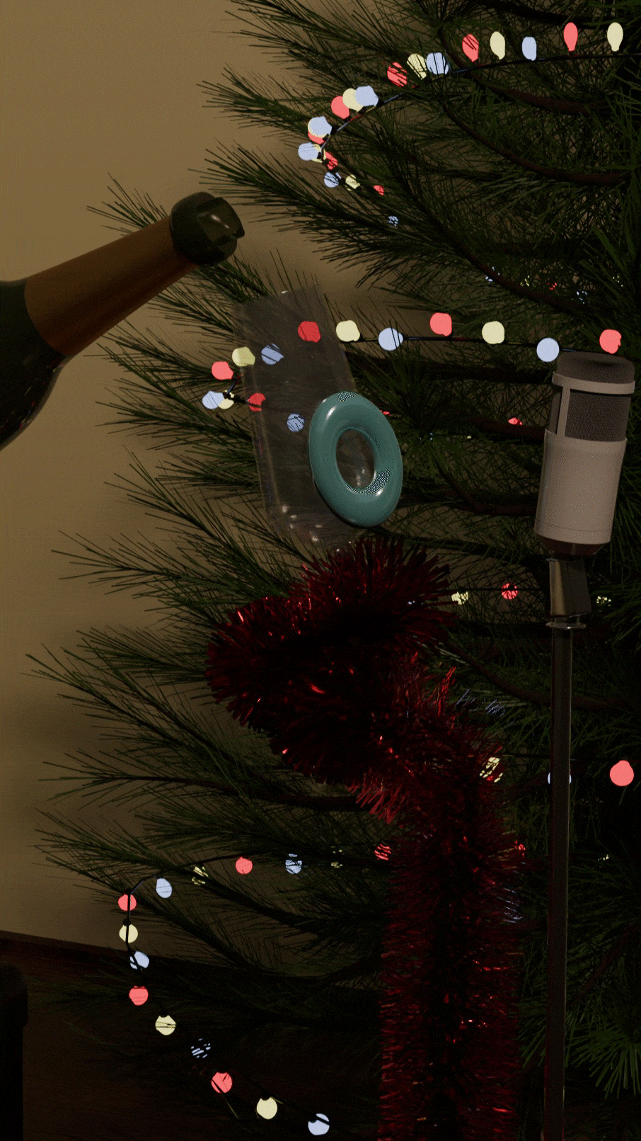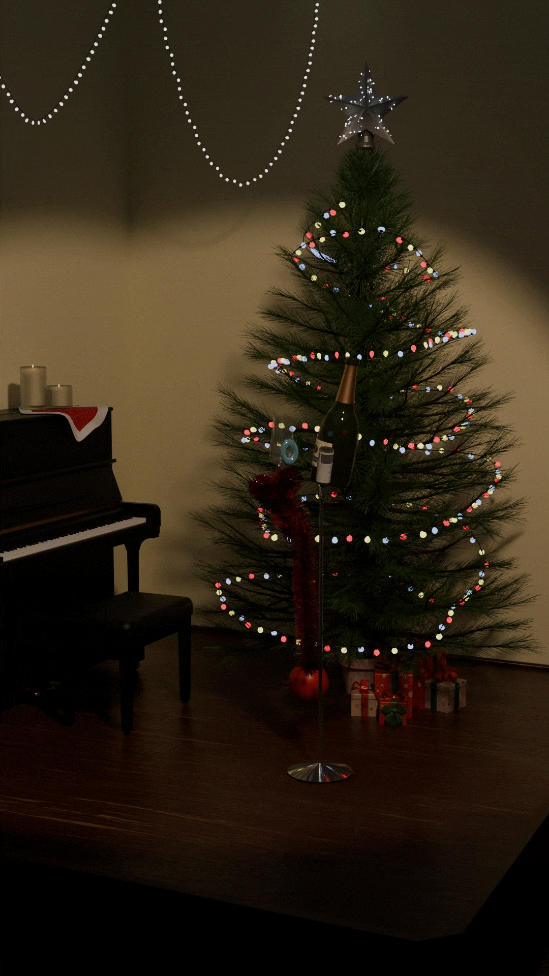An animated poster that creates a New Year’s Eve, a holiday mood. An atmospheric and cozy jazz performance: a glass and a bottle of champagne singing on stage with a Christmas tree and bright lights.