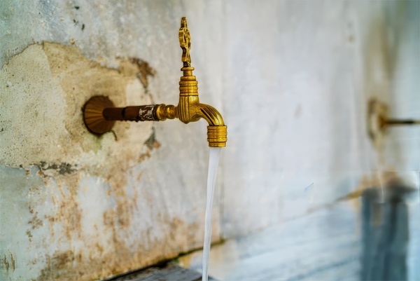 Антикварный кран для мечети — латунный кран. Istockphoto. Большая мечеть Хасана II, Касабланка, Марокко. Morocco Falktime
