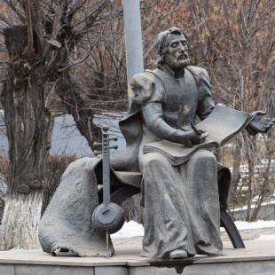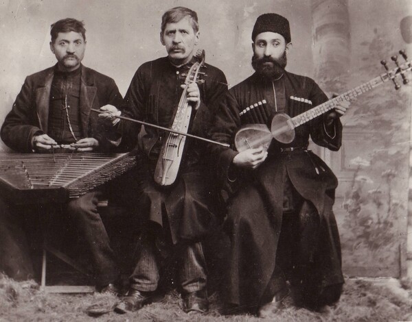 Армянский ашуг Дживани с каманом (в центре). 1897 год. // Памятник ашугу Саят-Нова с каманчой. Гюмри.
