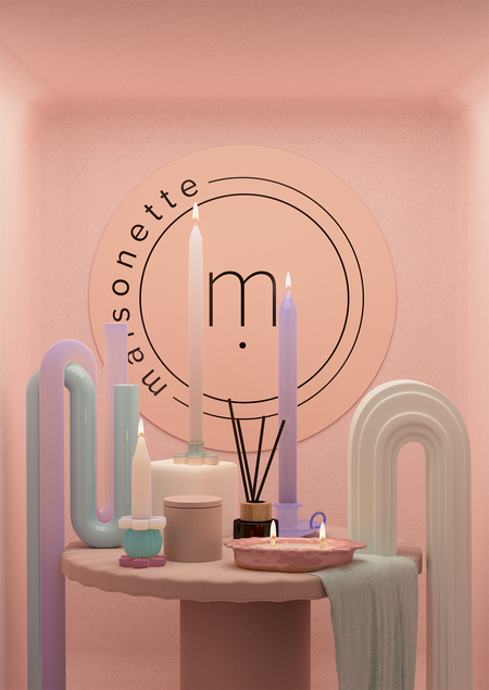 витрина проекта посвящена бренду maisonette. продукция бренда представляет собой различные свечи, ароматизаторы, диффузоры и подсвечники. часто можно подметить нежные цвета и природные материалы в сочетании с керамическими элементами. каждый из продуктов отсылает к уюту и комфорту, поэтому композиция выполнена в нежных пастельных тонах, отсылающих к бренду и передающих его атмосферу.
