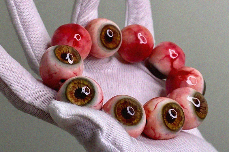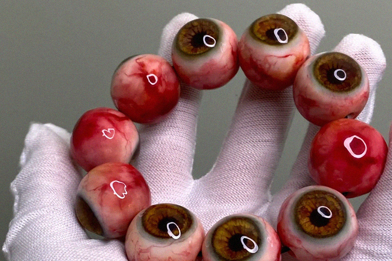 Украшения не просто имитируют человеческие глаза, но намеренно делают изображение болезненным, налитым кровью. В некоторых моделях искажается форма зрачка, становясь неестественной, или добавляются сюрреалистичные детали, такие как щупальца.