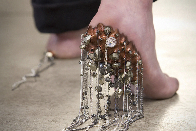 Украшения, которые взаимодействуют с телом, буквально проникая в него, превращают процесс ношения в пугающий акт — они вторгаются в тело, «захватывая» его, подчеркивая его уязвимость и болезненно нарушая его целостность.