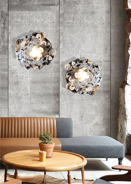 We present wall lamps made of recycled plastic. We purchase recycled plastic granules of various colors. Using a hand extruder and our technological methods, we create spatial objects. In the photo you can see a sconce based on a plastic frame. The frame is strewn with petals made of the same material. We are developing this direction and creating table lamps and other items that we can also present at the exhibition.