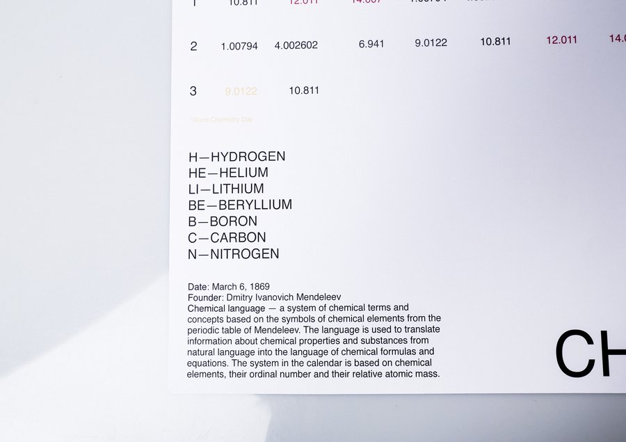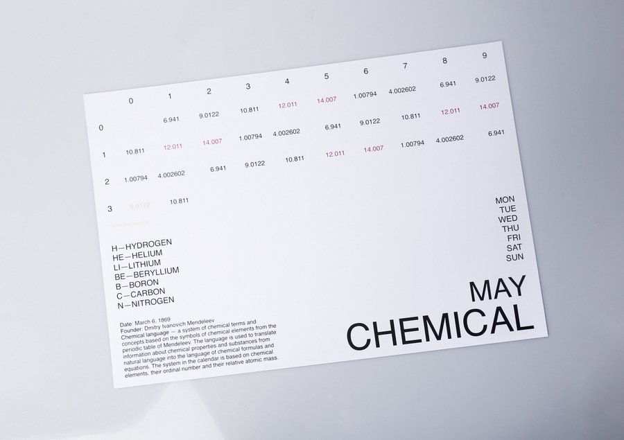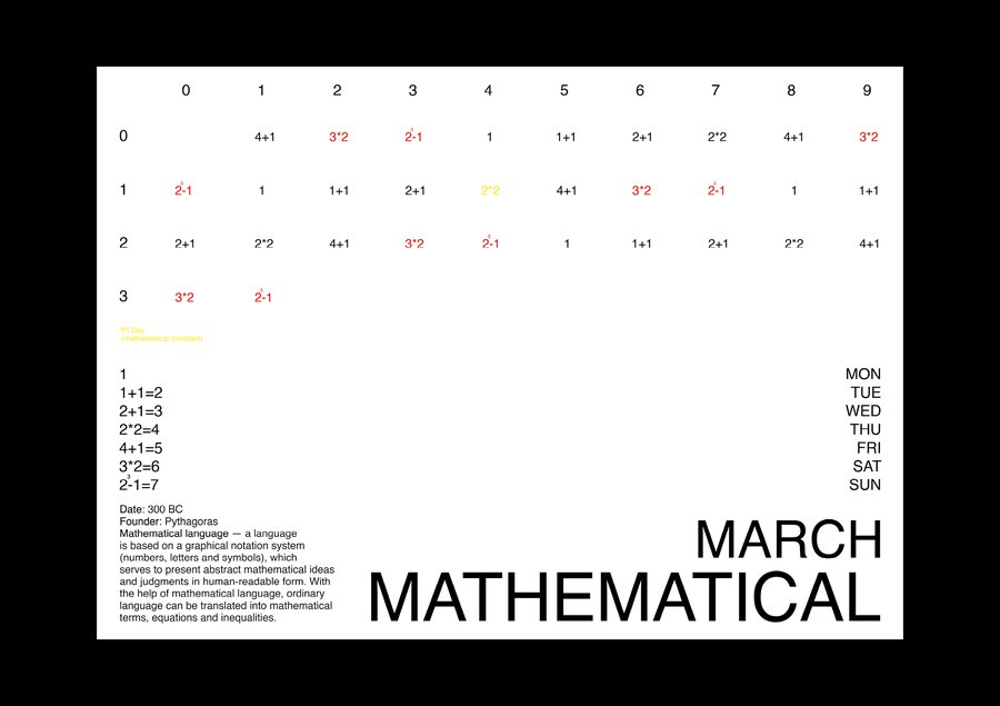 календарь создан на основе формальных языков, которые относятся к категории искусственных. формальный язык используется для кодирования естественного языка на систему знаков для определенных целей и отличается своей лаконичностью и однозначностью. каждый месяц в календаре посвящен одному языку, показывая его устройство: