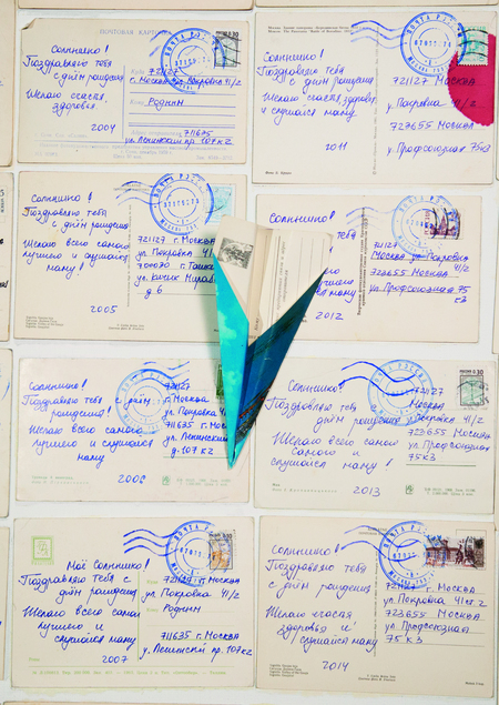 «Юбилей» — проект о двух мимолетных жизнях, пытающихся взаимодействовать, однако свобода от этого иногда становиться лучшим решением. Работа представляет собой набор из 49 подписанных почтовых открыток и 1 пустой. Открытки размещены на холсте надписями вверх, а последняя пустая собрана в оригами самолетика.