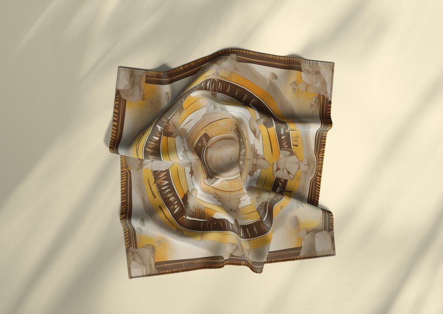 Промт: A square print featuring a equatorical safari theme. The design is centered around pastel shades of yellow, brown, white, orange to yellow smooth gradient. The main elements are sand, sand stones and dry sand cracks, depicted in a simple cartoon style without lineart, with intricate details that add depth to the overall design. The scarf is structured with central symmetry, featuring symmetrical elements such as sand, sand stones, dry sand cracks, and other details. A thin frame of vertical stripes adorns the outer edges, while a second frame of horizontal stripes adds further depth. More abstractive motives Repeated elements and a multitude of small details contribute to the calming and relaxing atmosphere of a arc getaway. Overall, the scarf should evoke a sense of relaxation and tranquility, while also being visually appealing. It should be suitable for both men and women.