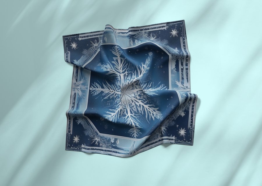 Промт: A captivating square scarf design measuring 130×130 cm, featuring a mesmerizing travel theme to both the Arctic and Antarctic regions. The primary color palette consists of a beautiful gradient from light blue to dark blue, symbolizing the frigid northern seas. In the center of the composition there is a large beautiful white snowflake with patterns. It is framed with a square carved frame around it. This frame is dark blue and contrasting. White and blue hues bring the iceberg to life, while delicate waves and snowflakes add realism to the scene. The scarf showcases central symmetry, with numerous small elements and a carved frame adorning the outer edges. A thin frame of vertical stripes borders the outer edges, while a second frame of horizontal stripes adds depth to the design. Repeated motifs and an abundance of small details contribute to the scarf’s soothing and tranquil atmosphere.