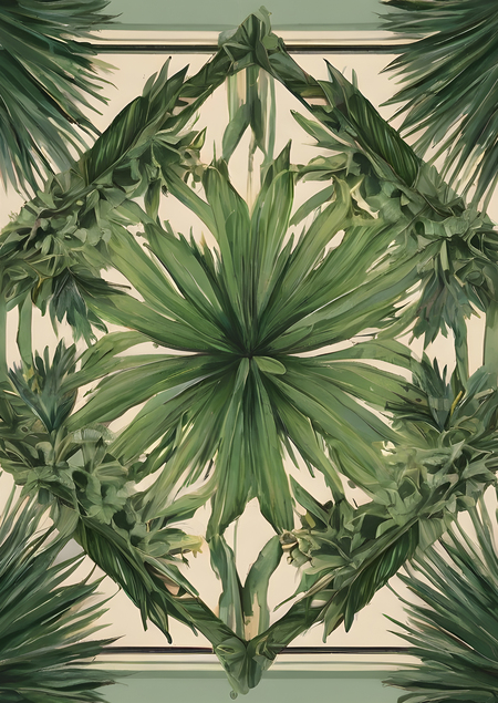 Промт: Create a print for a square scarf, 130×130 cm Subject: Travel to tropical places Elements: palm trees, cacti Colors: pastel shades of light green and dark green, gradients Structure: central symmetry, symmetrical elements, thin frame on the edges, 2 frame levels. the first is thin vertical stripes, the second is horizontal stripes, thicker. repeated elements, a lots of small details. The print should be designed in such a way that it reflects the atmosphere of a trip to a tropical country. The main elements of the print are palm trees and cacti. They should be depicted in a cartoon simple style without lineart, with attention to detail. The colors of the scarf should be pastel shades of green. This will create a calm and relaxing atmosphere. Gradients can be used to add depth and texture to the design. The structure of the scarf is based on symmetrical elements. These can be palm leaves, branches, or other details. A thin frame can be added around the edges of the scarf