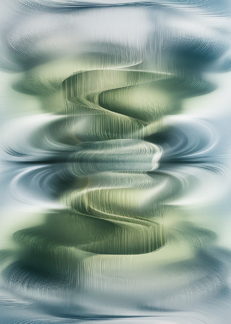 Плакат 4. Промт: A mesmerizing photograph that captures the essence of the current Behance trends, with a light paper acting as the exquisite canvas. The image features soft, natural hues of green and blue, delicately swirling and intertwining throughout the composition. The skillful blending of contours and gradients intertwines seamlessly with the distinctive, grainy texture of the risograph, resulting in a harmonious and visually captivating piece of art. The evocative vaporwave style, marked by blurred gradients and the enchanting risograph texture, transports the viewer to a magical, nostalgic world., photo