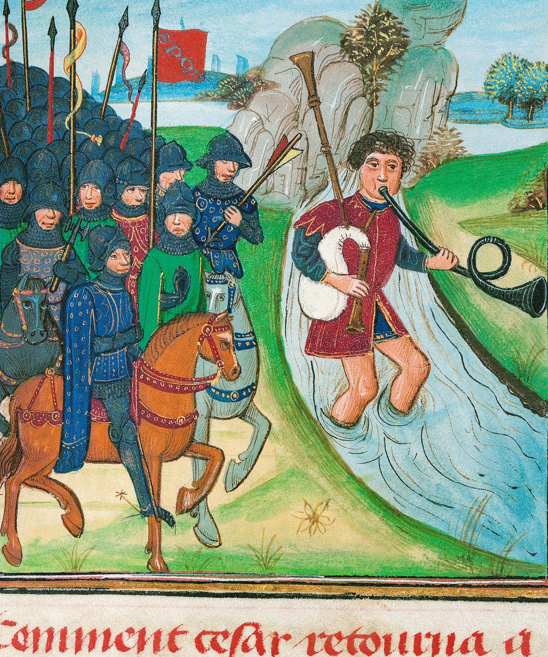 На миниатюре мы видим Юлия Цезаря в средневековых одеждах и с волынкой (мотив, безусловно, пародийный), идущего на Рим во главе своих легионов: войска как раз достигли Рубикона. Здесь Цезарь произносит знаменитые слова «жребий брошен» и, нарушив закон, идет дальше. На одном из штандартов можно видеть надпись SPQR, расшифровывающуюся как Senatus populusque romanus, то есть «Сенат и народ Рима».