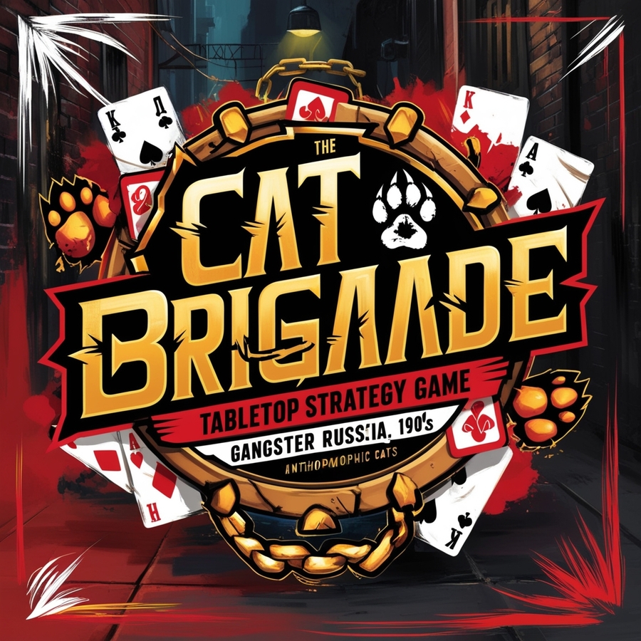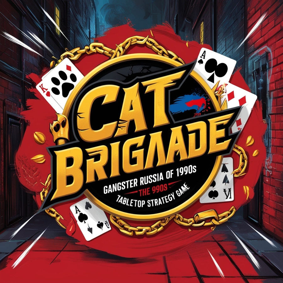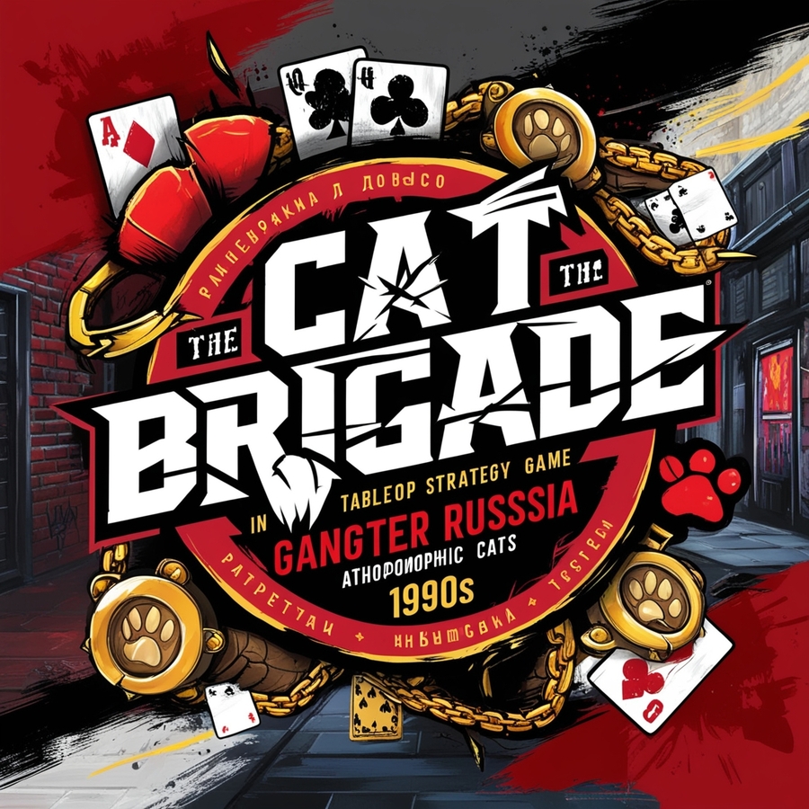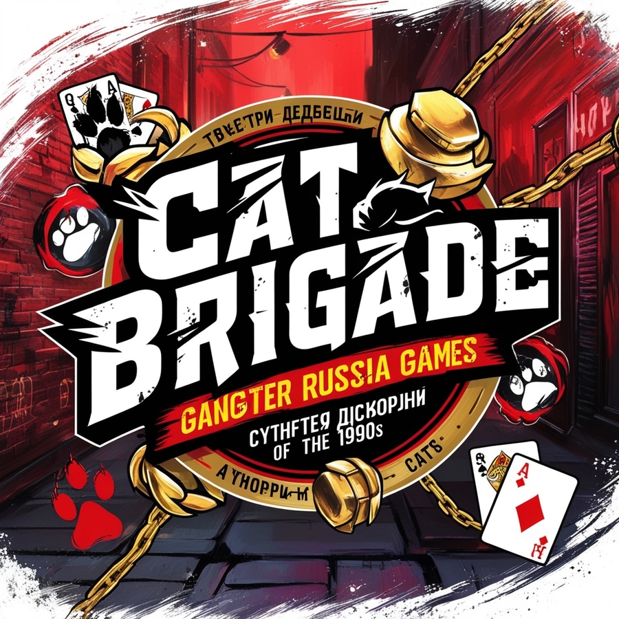 Ответ A bold and dynamic logo for a tabletop strategy game named the «Cat brigade» set in the gangster Russia of the 1990s, featuring anthropomorphic cats. The logo includes a stylized title in a Cyrillic inspired font with sharp, claw scratch accents. Surrounding the text, add thematic elements like paw prints, claw marks, gold chains, and playing cards. The design should incorporate a gritty yet vibrant aesthetic, with a color palette of deep reds, blacks, and golds, accented by splashes of neon. The background features subtle textures like brick walls, graffiti, or smoky alleyways to enhance the 90s gangster vibe. The overall style is expressive, painterly, and playful, while maintaining an edgy and mischievous tone.