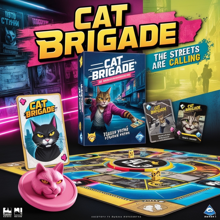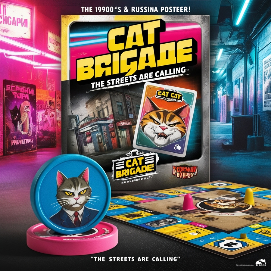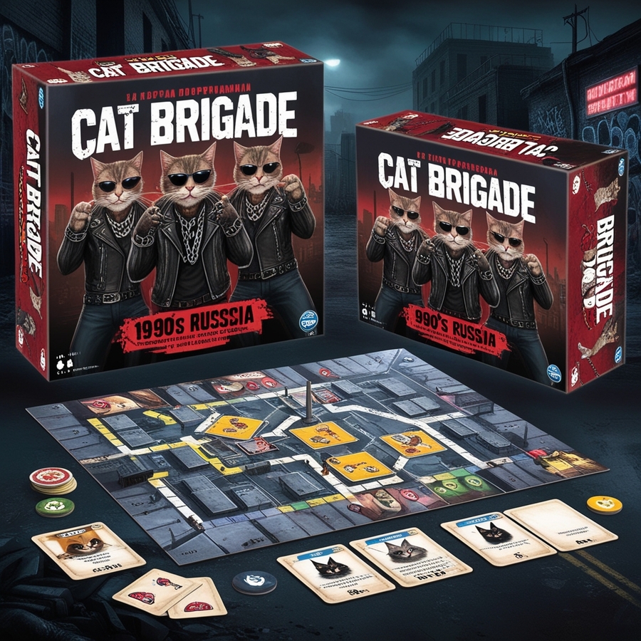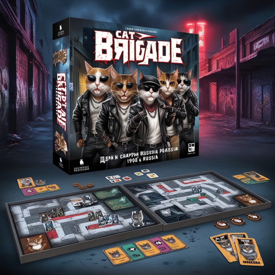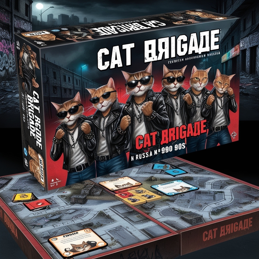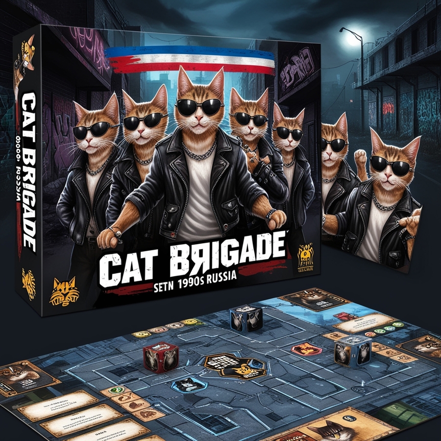 Ответ «Photorealistic image of a board game titled 'Cat Brigade' set in 1990s Russia. The game box features a gritty, urban design with a group of bandit cats wearing leather jackets, chains, and sunglasses, posing in a rebellious, tough manner. The cats exude the raw, street-smart energy of 90s Russian gang culture. The background depicts a dark, post-Soviet cityscape with graffiti-covered walls, neon signs, and abandoned buildings, all under a dim, moody sky. The title 'Cat Brigade' is written in bold, distressed Cyrillic-style font. The game board, visible inside the open box, shows a detailed map of urban streets and alleys with elements like cat tokens, cards, and character tablets featuring tough cat characters. The overall design is realistic, gritty, and full of nostalgia, capturing the essence of Russia’s turbulent 90s.»
